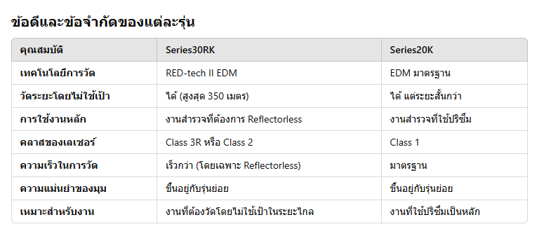 โดยสรุป หากเทียบกันด้านต้นทุนและลักษณะงานที่ต้องการความละเอียดสูงต่อเนื่องโดยไม่ต้องใช้เป้า Series30RK จะตอบโจทย์กว่าด้วยระยะวัด Reflectorless ที่ไกลและเทคโนโลยีการประมวลผลที่รวดเร็ว ส่วน Series20K เหมาะสำหรับองค์กรหรือโครงการที่งบประมาณจำกัดและเน้นวัดด้วยปริซึมเป็นหลัก โดยยังคงให้ความแม่นยำในระดับมาตรฐานของงานสำรวจทั่วไป ดังนั้นการเลือกระหว่างสองรุ่นนี้ จึงขึ้นอยู่กับลักษณะการใช้งาน ระยะที่ต้องการวัด และความสะดวกในการจัดหาอุปกรณ์เสริมอย่างปริซึมและแผ่นสะท้อนให้ครบถ้วนตามความจำเป็นของหน้างาน