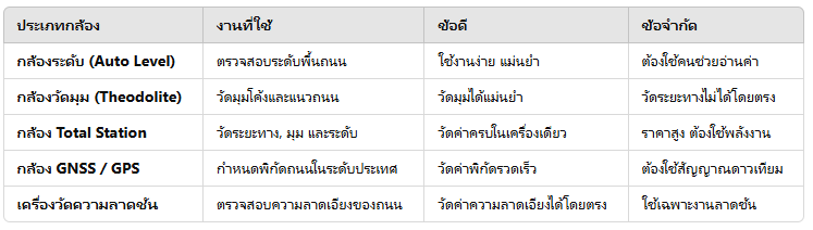 ตารางเปรียบเทียบกล้องสำรวจในงานถนน
