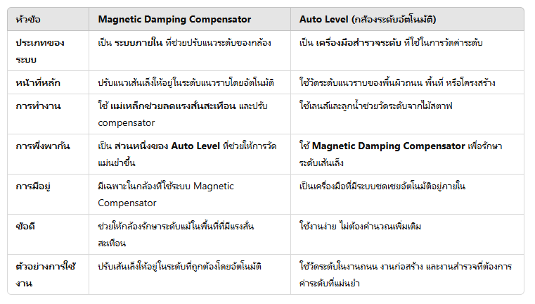 Magnetic Damping Compensator และ Auto Level มีความสัมพันธ์กัน แต่เป็น องค์ประกอบที่แตกต่างกัน ในการทำงานของกล้องสำรวจ