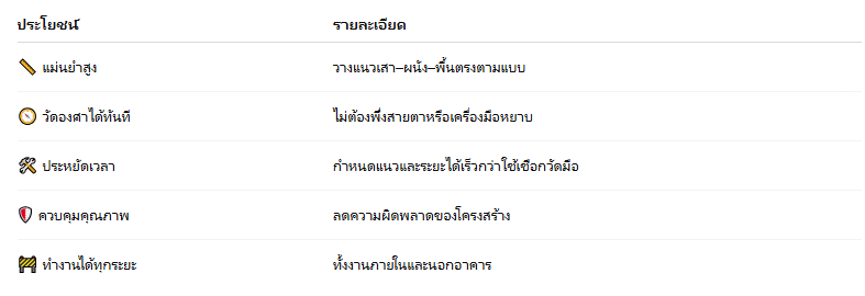 - วัดมุมฉาก 90° เพื่อวางตำแหน่งผนัง, เสา, หรือฐานราก
