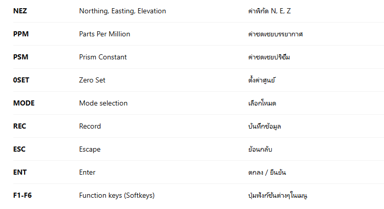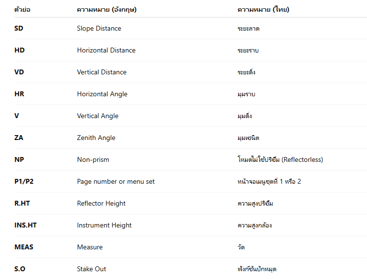 ตัวอักษรย่อที่พบในการใช้งาน กล้อง Total Station