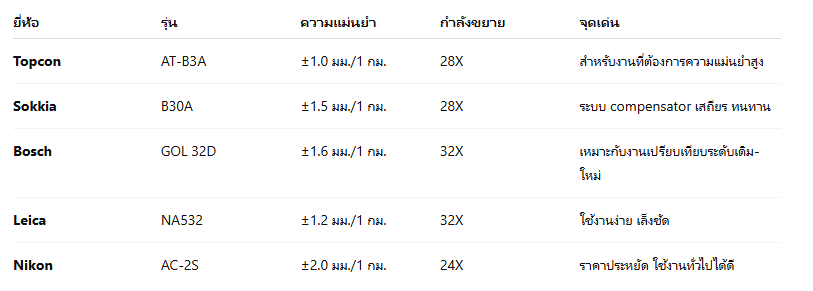 กล้องระดับสำหรับงานคืนระดับ ควรมี ความแม่นยำสูง, ระบบ compensator ที่เสถียร, ใช้งานได้ดีในสภาพพื้นที่หลากหลาย, เลนส์คุณภาพสูงและอ่าน staff ชัดเจน