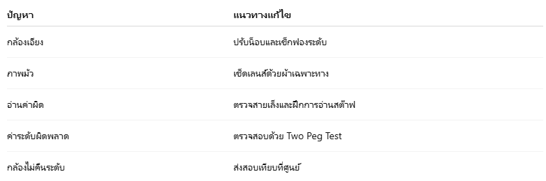 วิธีแก้ | ตรวจสอบด้วย Two Peg Test → ถ้าคลาดเคลื่อน ส่งสอบเทียบทันที |