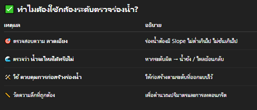 การใช้ กล้องระดับ (Auto Level) ตรวจสอบ ร่องน้ำระบายน้ำฝน เป็นวิธีที่นิยมมากในงานก่อสร้างและโยธา เพราะสามารถตรวจวัด ความลาดเอียง (Slope) และ ระดับความลึก (Elevation) ของร่องน้ำได้อย่างแม่นยำ ซึ่งเป็นสิ่งจำเป็นเพื่อให้ น้ำไหลได้ดี ไม่ท่วมขัง