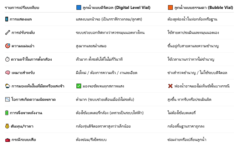 การเปรียบเทียบระหว่าง ระบบลูกน้ำแบบดิจิตอล (Digital Level Vial) กับ แบบธรรมดา (ฟองน้ำหรือ Bubble Vial) ในกล้อง Total Station เป็นสิ่งที่ช่างสำรวจควรเข้าใจ เพื่อเลือกใช้งานได้อย่างเหมาะสมกับความชำนาญและสถานการณ์หน้างาน