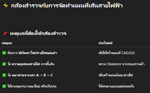กล้องสำรวจ เช่น Total Station เป็นเครื่องมือสำคัญในการจัดทำแผนที่เส้นสายไฟฟ้า เพราะช่วยให้: