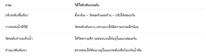 การใช้ กล้องระดับ (Auto Level) ในงานเกษตรและชลประทาน มีบทบาทสำคัญในการจัดการพื้นที่เพาะปลูกและระบบน้ำอย่างมีประสิทธิภาพ โดยช่วยควบคุมระดับพื้นที่ให้เหมาะสมกับการระบายน้ำ, กักเก็บน้ำ และการถมดินเพื่อวางระบบชลประทานได้แม่นยำ