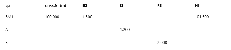 คำนวณหาระดับกล้อง (HI) จากค่าระดับจุดอ้างอิง (BM) แล้วใช้ HI หักด้วยค่าอ่านหน้าไม้ (FS) เพื่อหาค่าระดับจุดต่างๆ