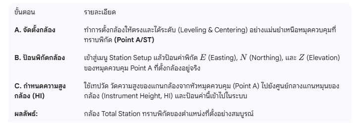 การตั้งค่า Station คือกระบวนการที่ทำให้กล้อง Total Station ทราบพิกัดตำแหน่งที่มันตั้งอยู่จริง ซึ่งเป็นหัวใจของการเชื่อมโยงงานสำรวจเข้ากับระบบพิกัดของโครงการ